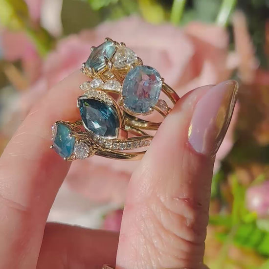 This 2.37 ct Light Blue Sapphire Engagement Ring features six marquise diamonds, creating a stunning and unique design. The light blue sapphire adds a touch of elegance and sophistication, perfect for any engagement. With a total carat weight of 2.37, this ring is sure to make a statement.