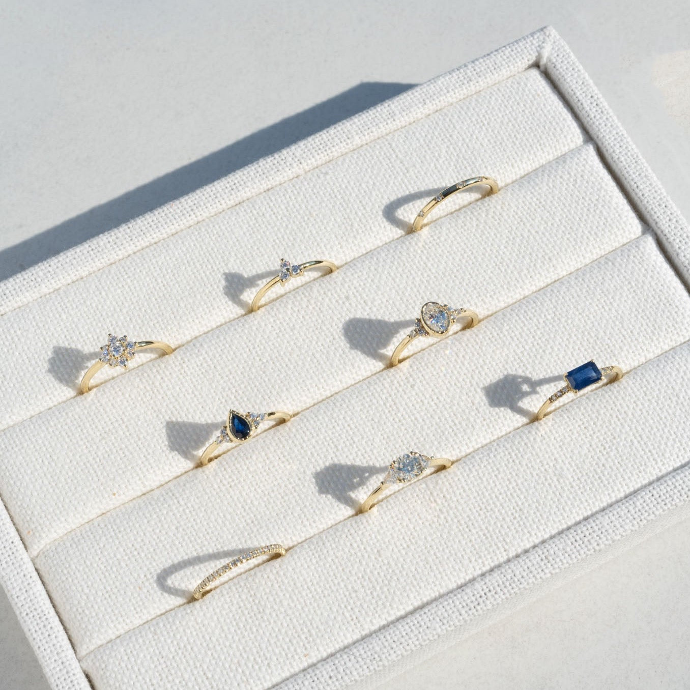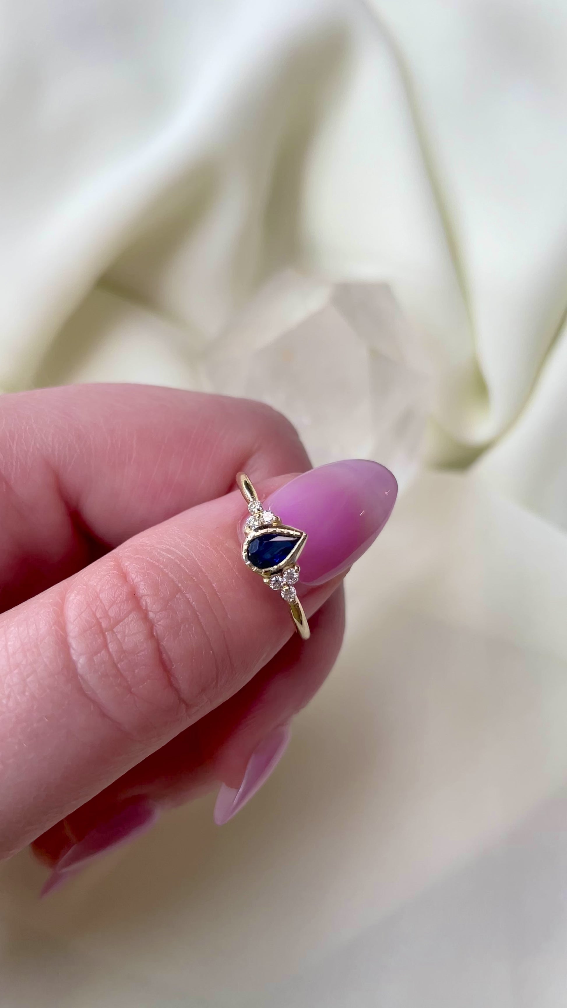 This deep blue pear-shaped sapphire gives a modern take to a charming vintage cluster engagement ring style. With dainty diamond accents, we think this ring is perfectly balanced, feminine and made for stacking.