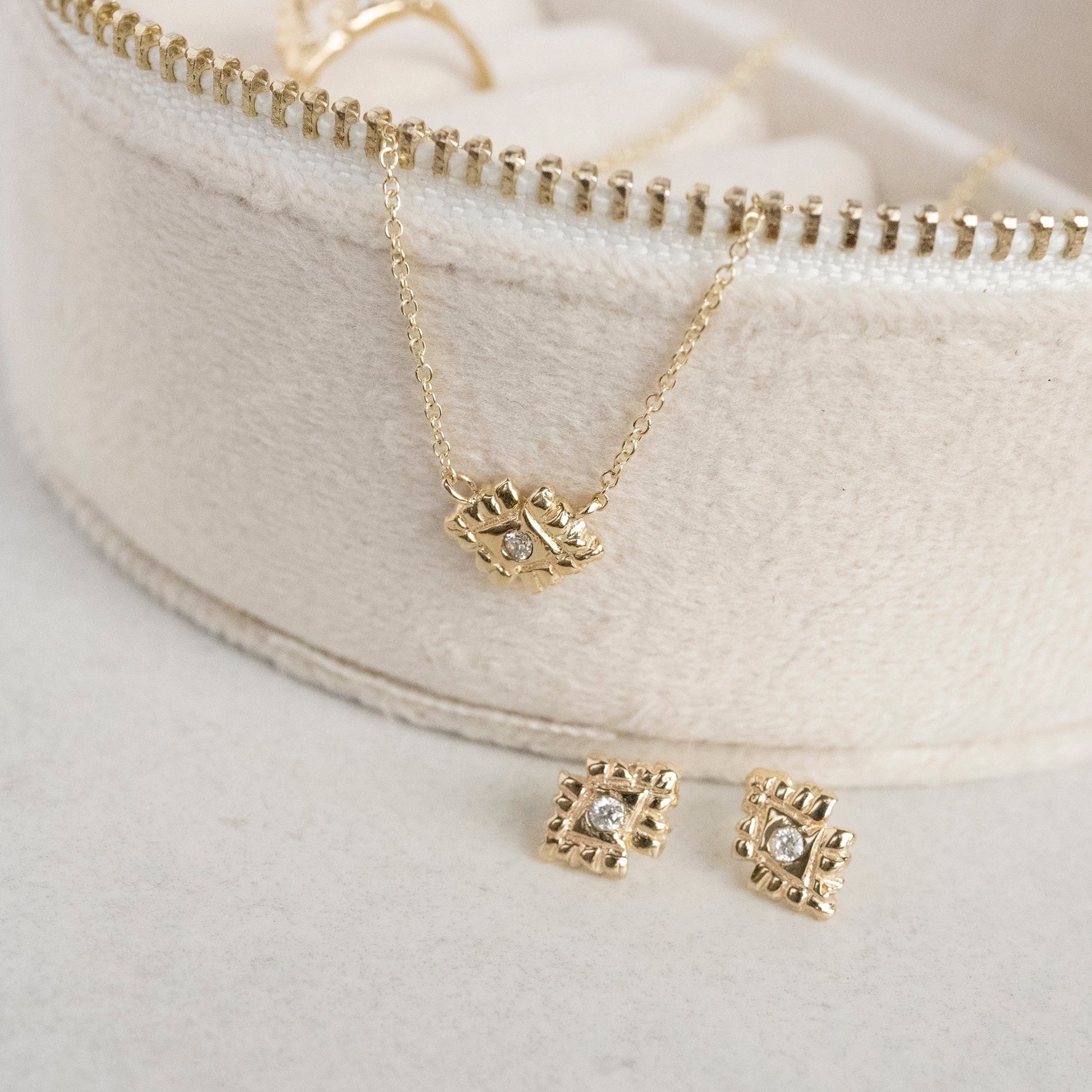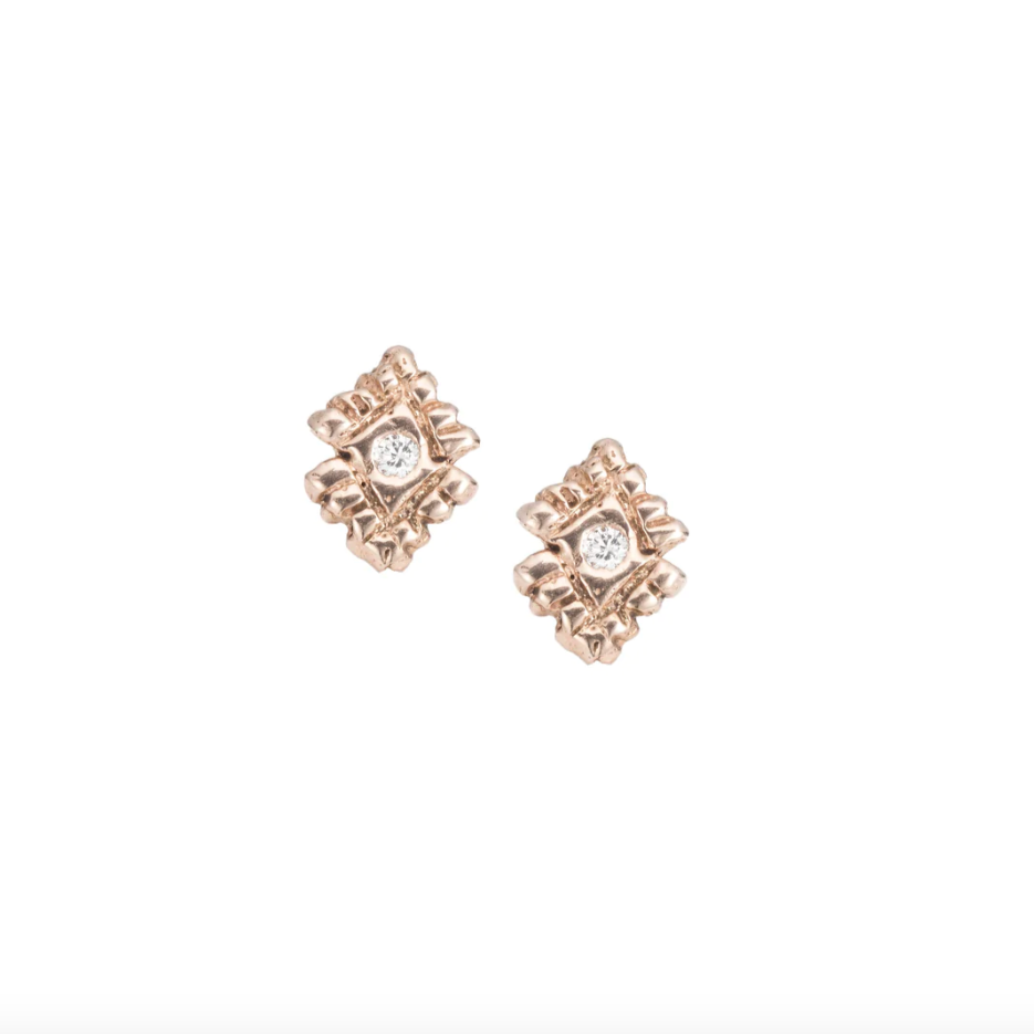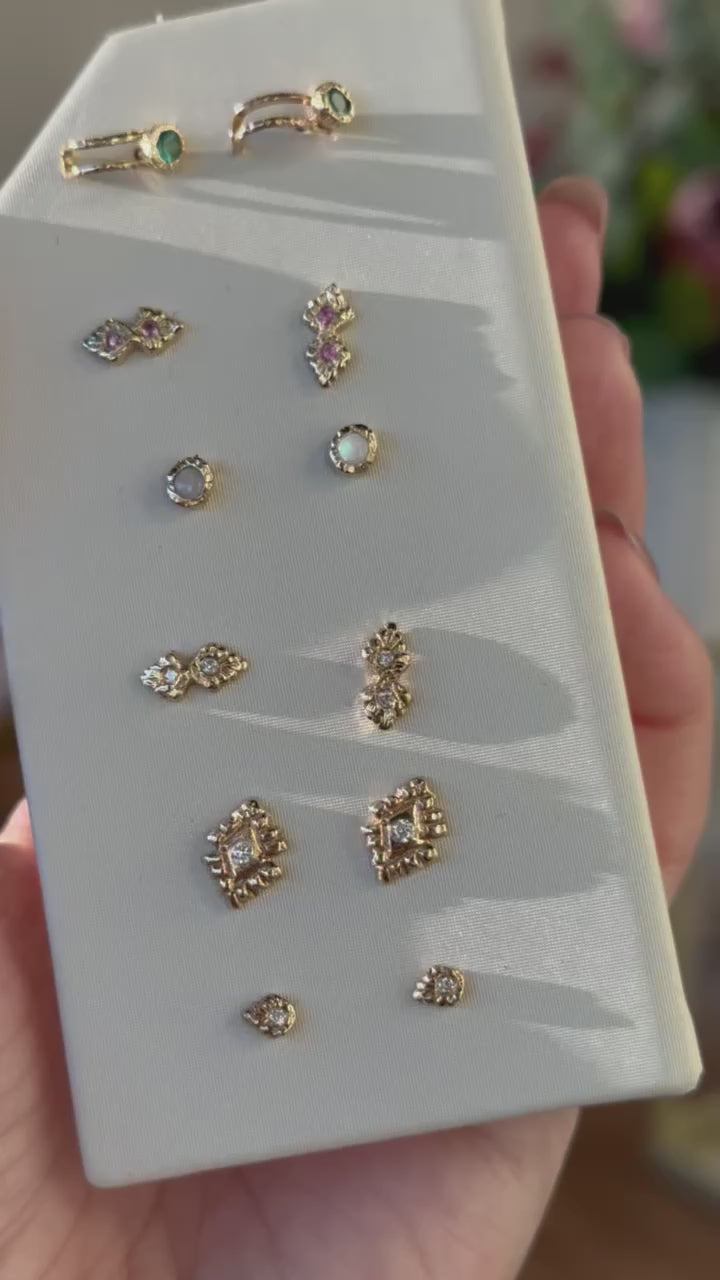 Stunning 2mm diamonds with two partial halos of solid gold, these earrings are sure to help you remember that you are always guided and protected. This gorgeous handmade earrings pair especially well with other designs by Communion By Joy, pictured below.