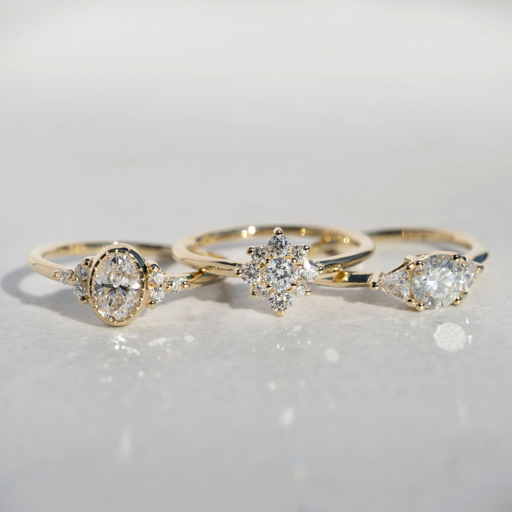 A modern take on the timeless three stone setting, this stunning center stone is highlighted by two bold trillion cut diamonds. This engagement ring is the perfect celebration of love and pairs stunningly with contoured bands.
