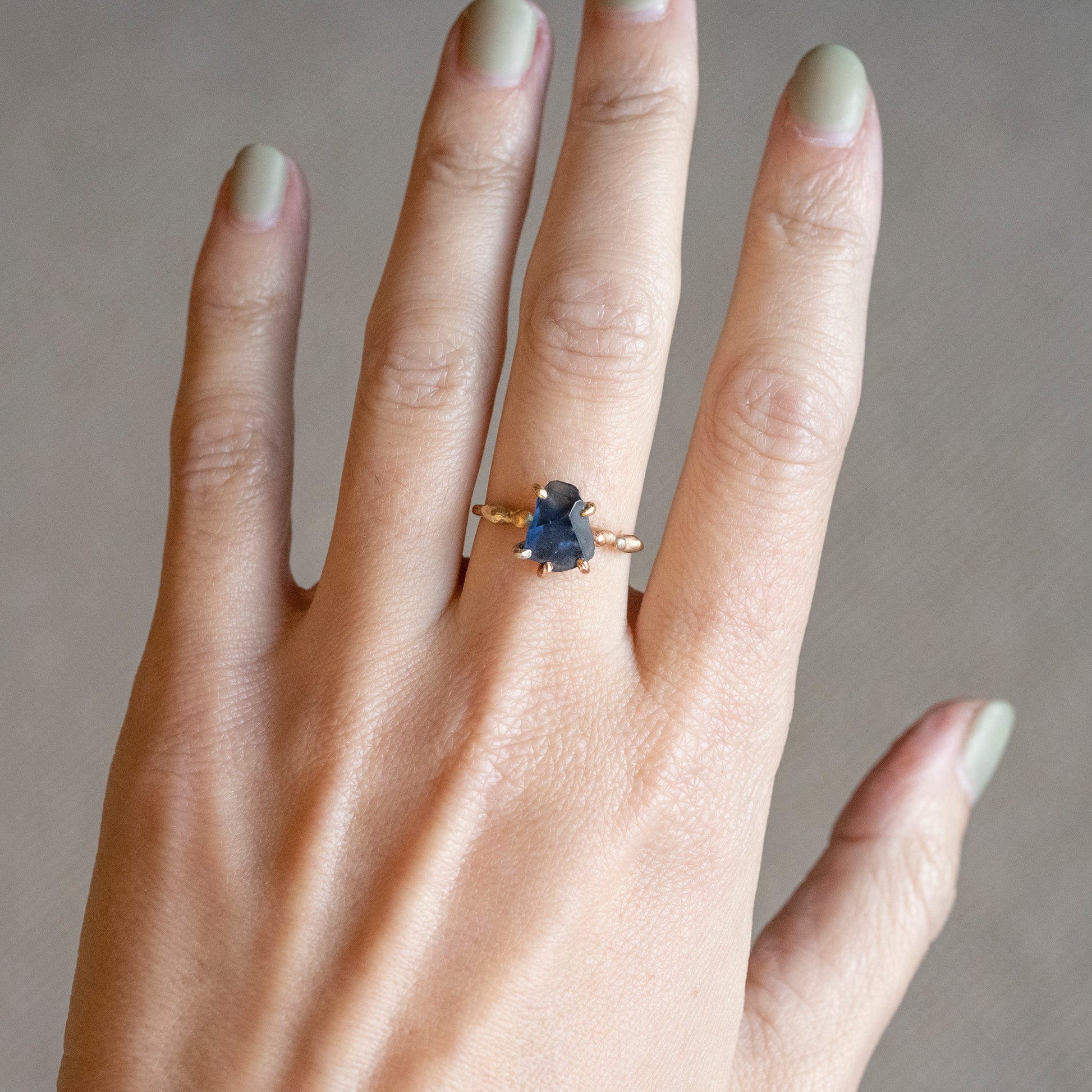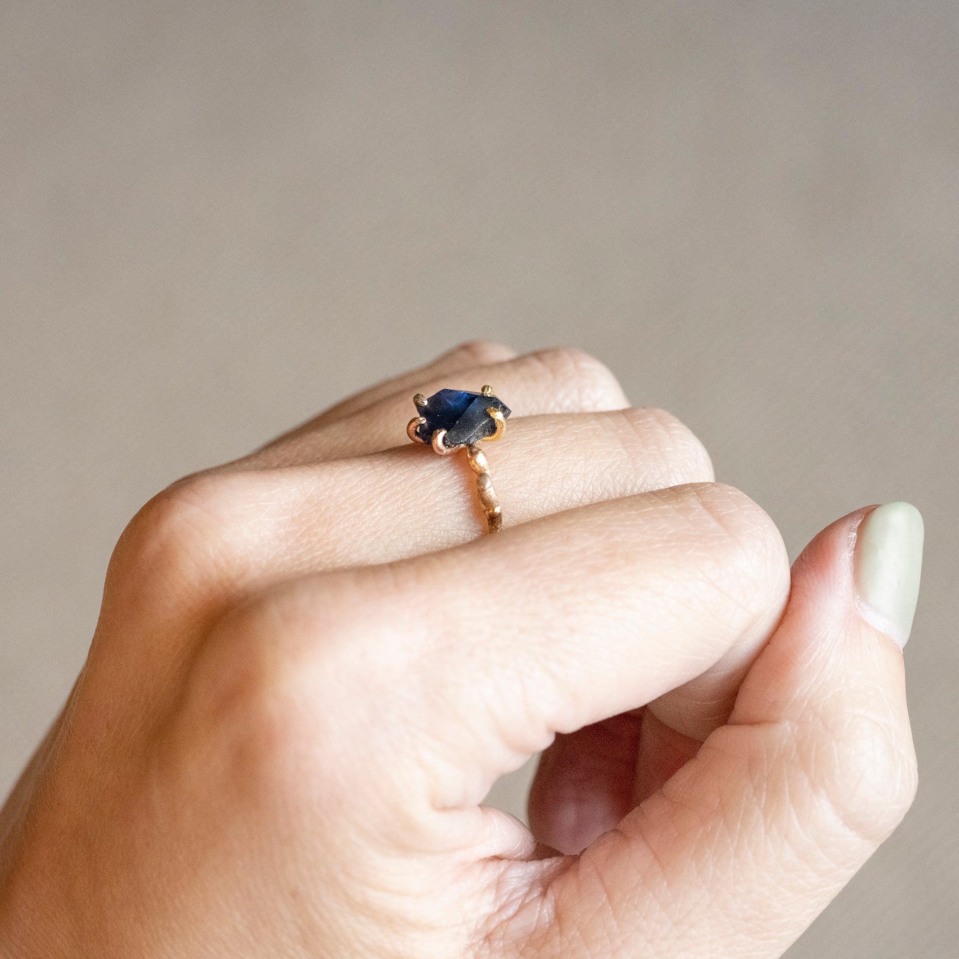 Like a fragment of ocean depths crystallized by time's patient hand, this rough-hewn blue sapphire emerges untamed and honest in its natural beauty. For those who understand that perfection often lies in nature's unscripted moments, this ring serves as a daily reminder of the ocean's untamed spirit. Layer it with other maritime treasures to create your own symphony of blues, or let it stand alone as a singular testament to the raw poetry of natural stones.
