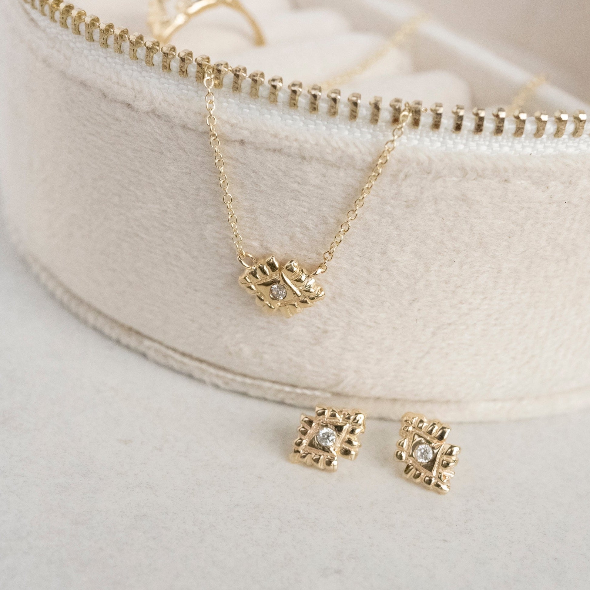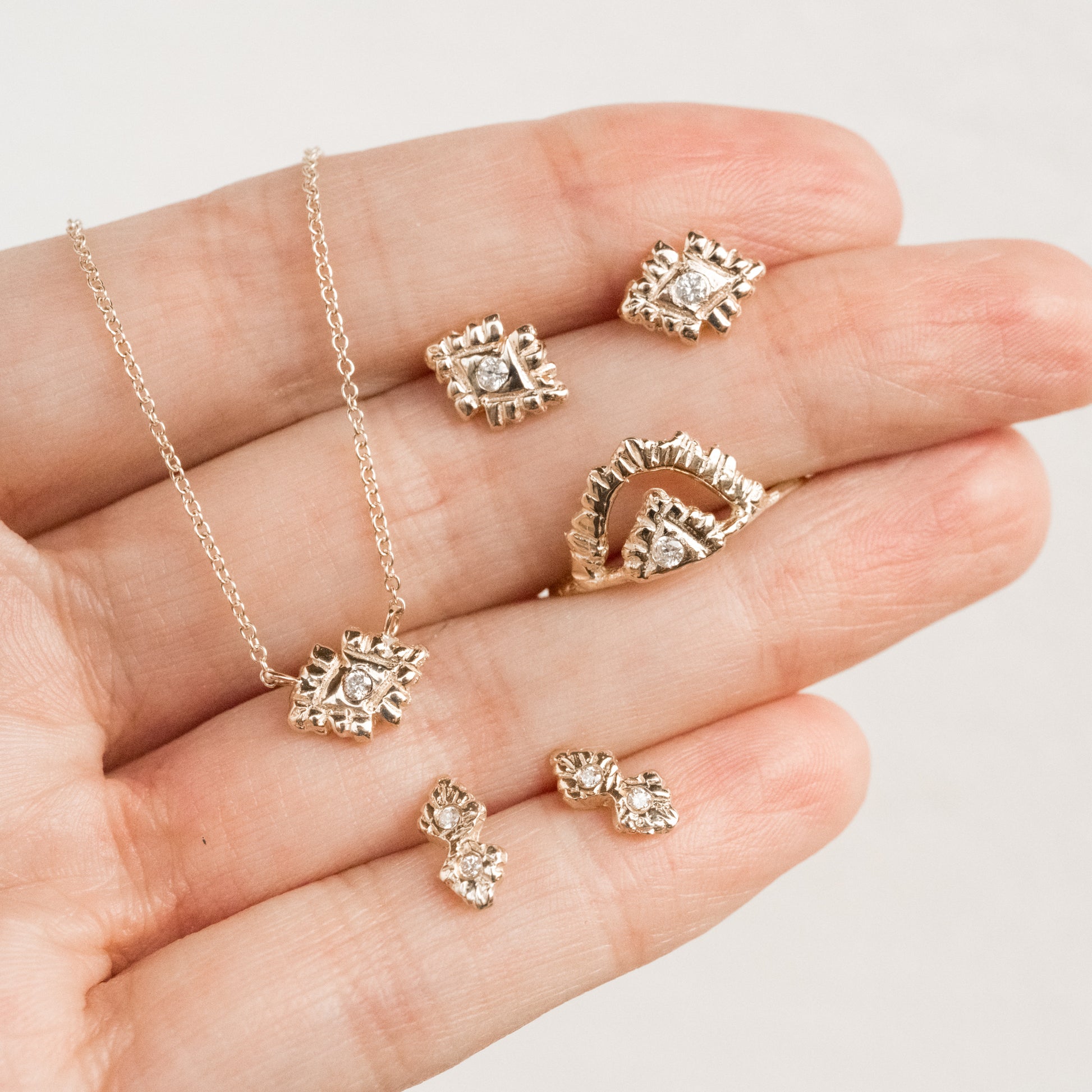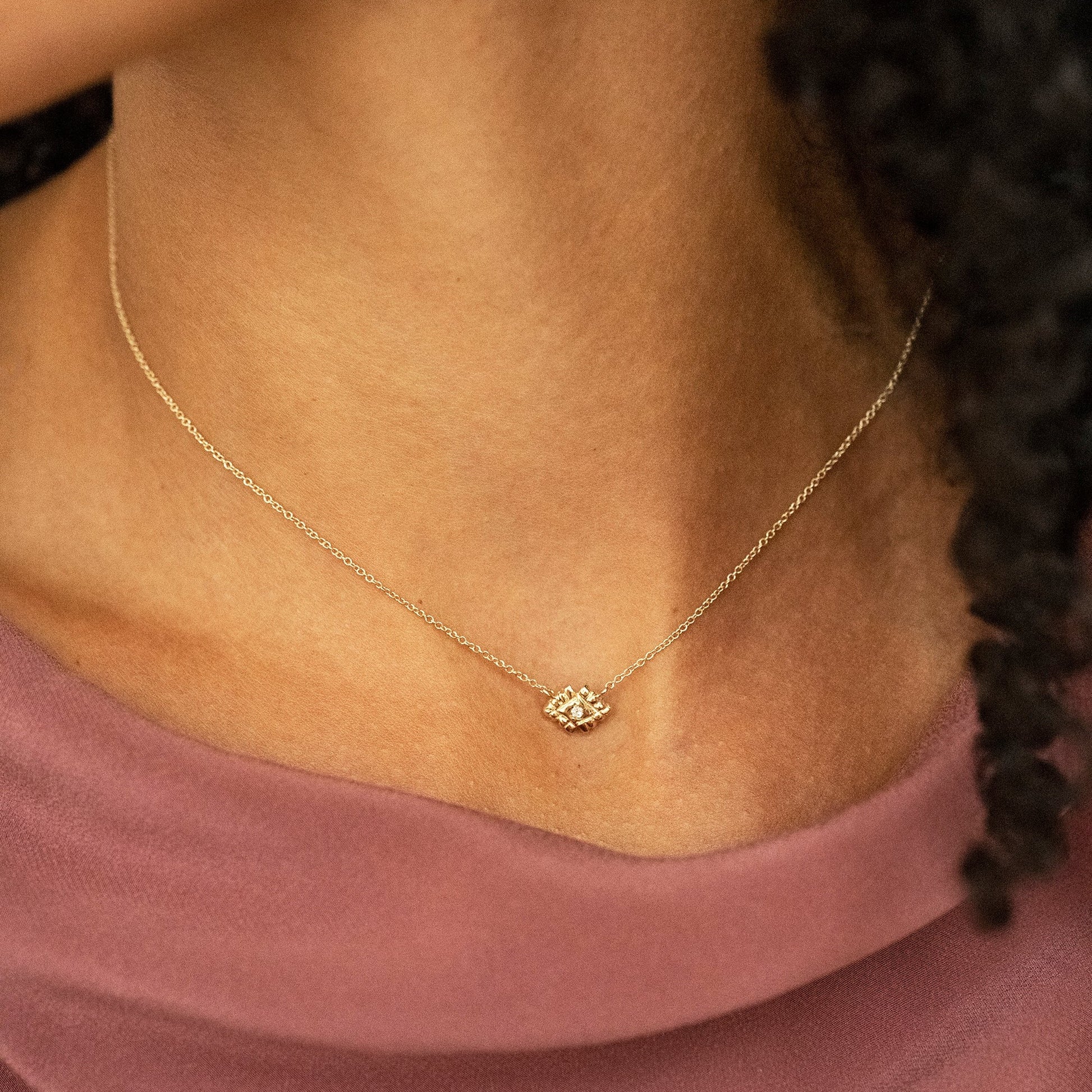 This unique necklace design by Communion by Joy features a stunning 2mm white diamond set in an organic halo motif and is sure to help you open your third eye by letting your inner and spirit protect you. This piece pairs especially well with other diamond designs by this designer.