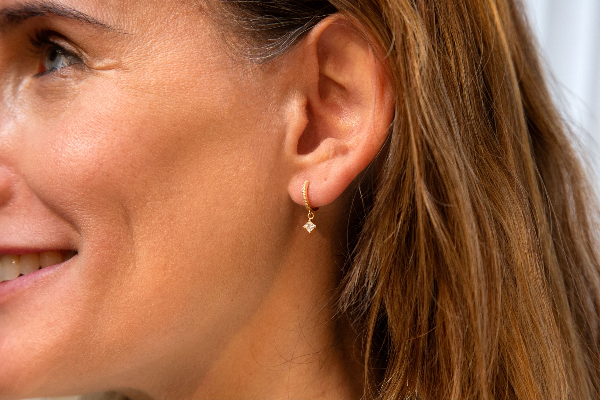 Effortlessly elevate your look with our Pavé Huggies with Princess Cut Diamond Charm. These stunning earrings feature a delicate pavé design, accented by a sparkling princess cut diamond charm. Perfect for adding a touch of glamour to any outfit.