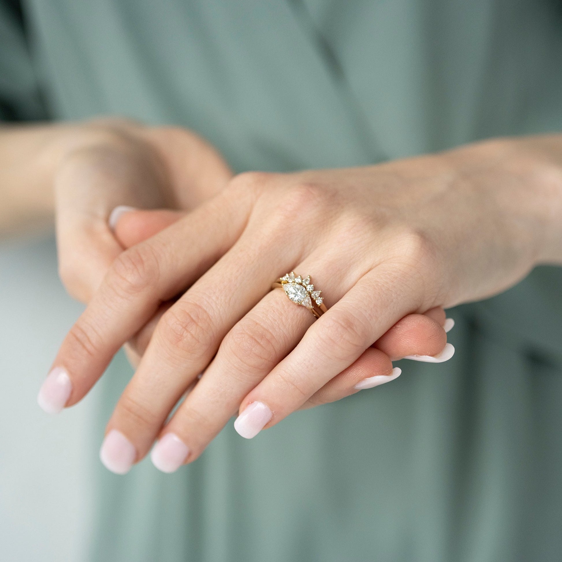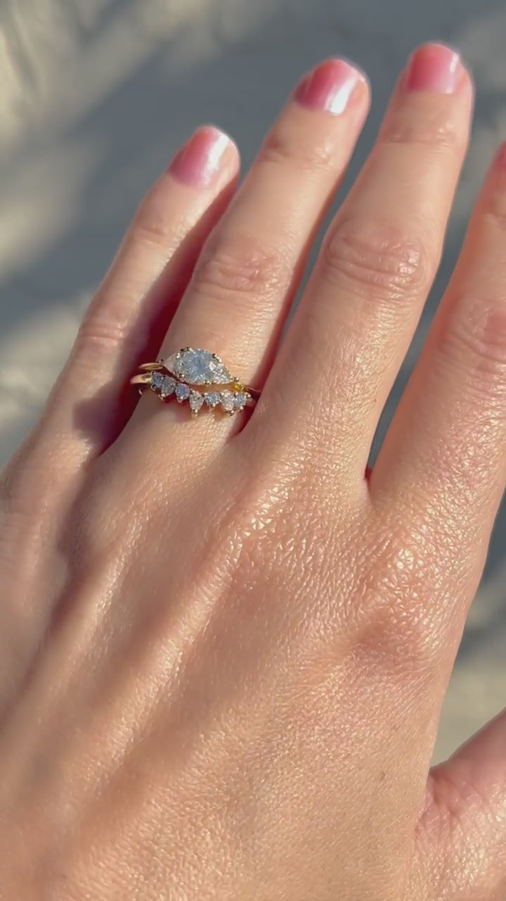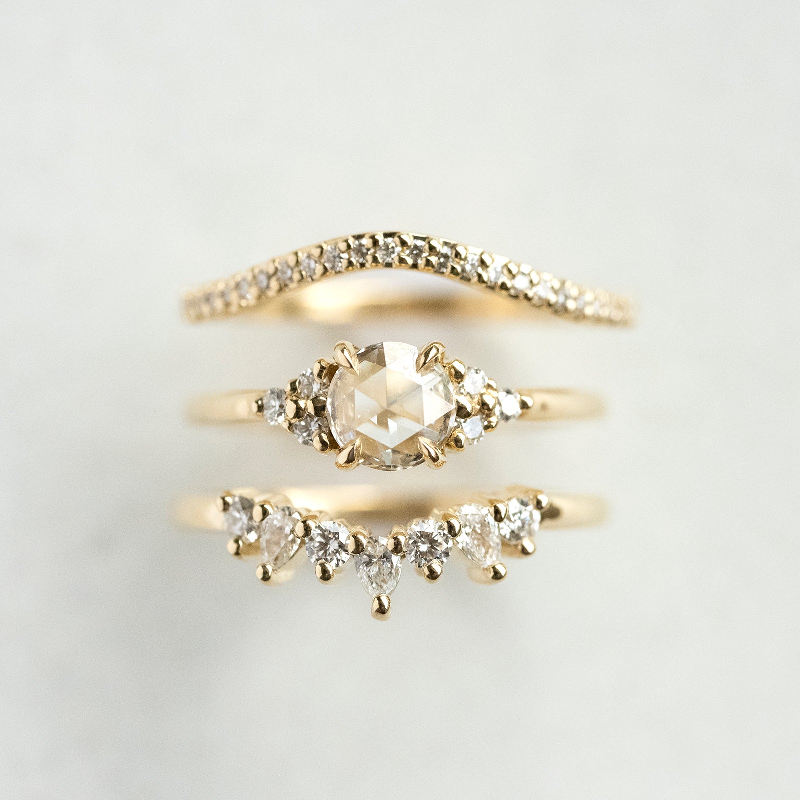 The perfect diamond wedding band to pair with larger engagement rings. The modern design sets seven brilliant diamonds into a delicate, feminine contour meant to celebrate and highlights other rings. We think this pairs the most perfectly with three-stone engagement rings, but the possibilities are truly endless.