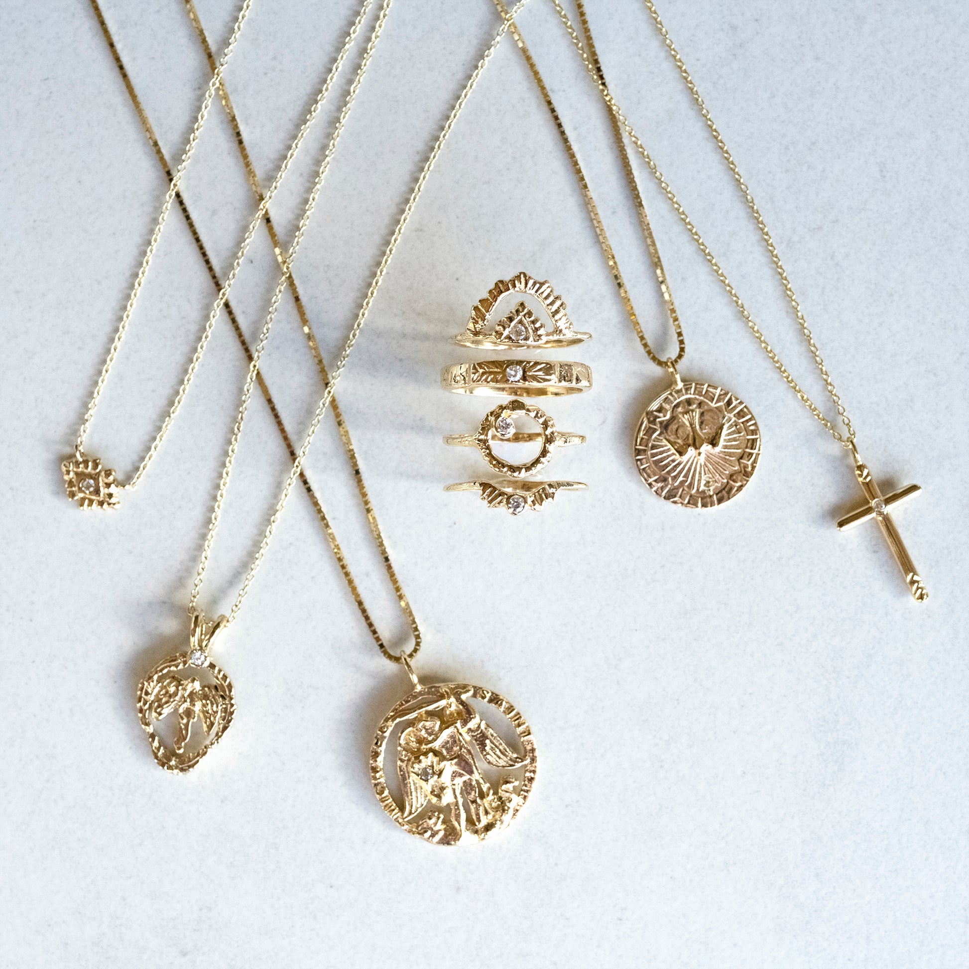 This stunning pendant reminds us that guardian angels protect us on our journey here on earth. This hand-carved special guardian surrounded by feathers gives us feelings of love and comfort. Pair this with other medallion necklaces for a maximalist style or wear it as a standalone.