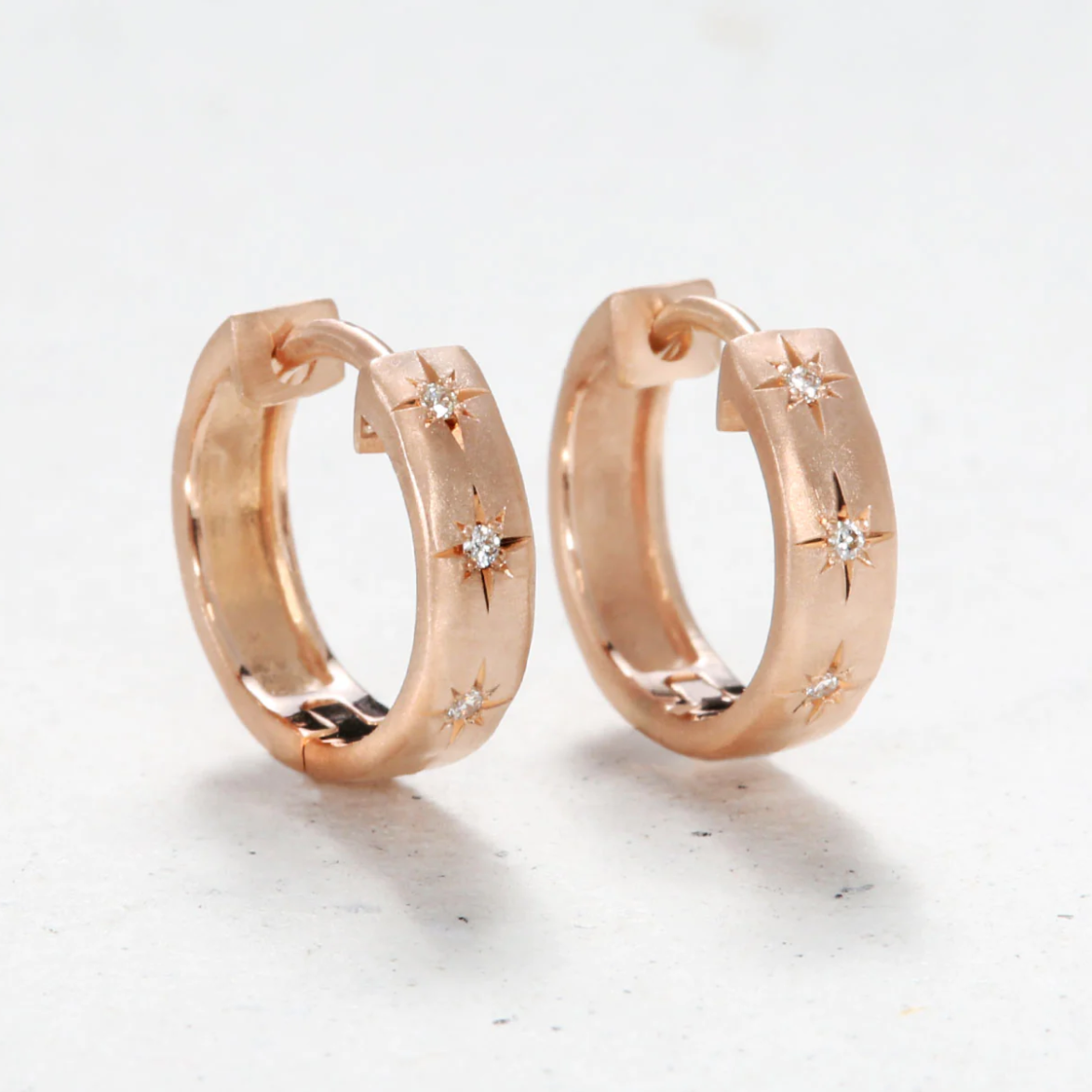 Exquisitely crafted, these Star Hoop Earrings feature meticulously placed star-set diamonds that shimmer and sparkle like celestial bodies in the night sky. As luminous beacons of light, they carve their own path, guiding you with their mesmerizing glow.