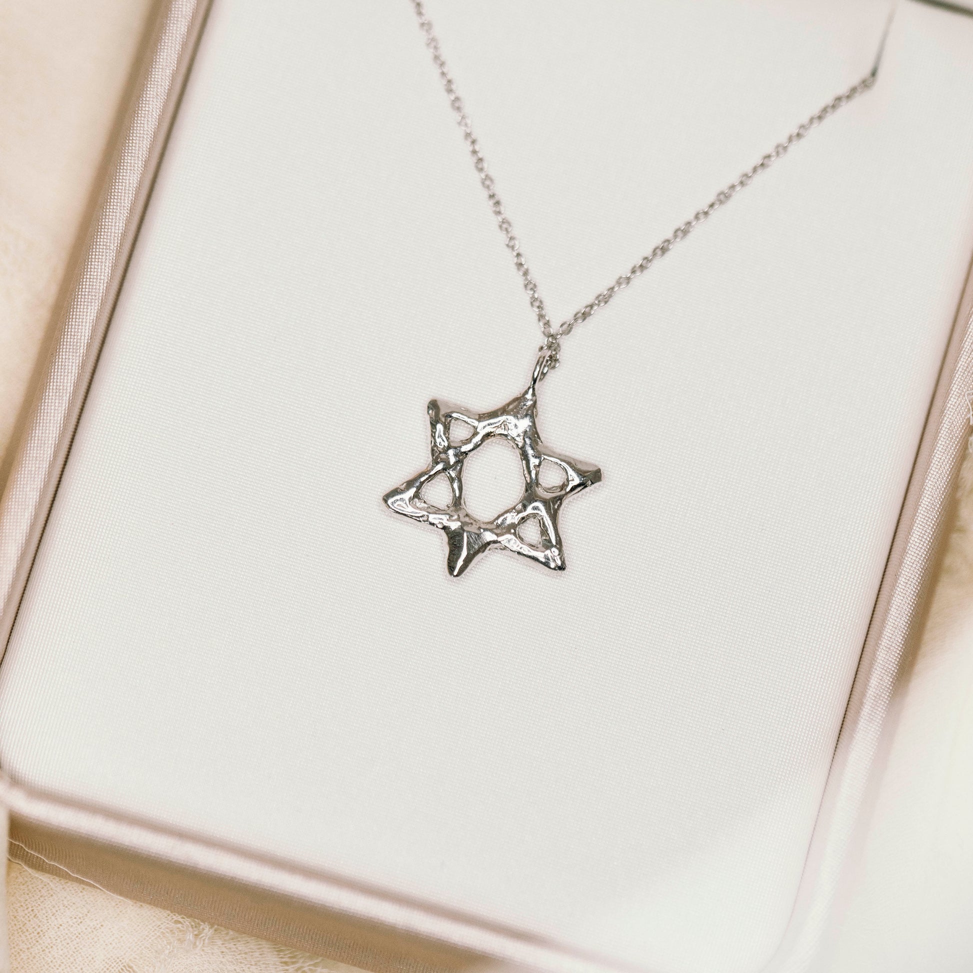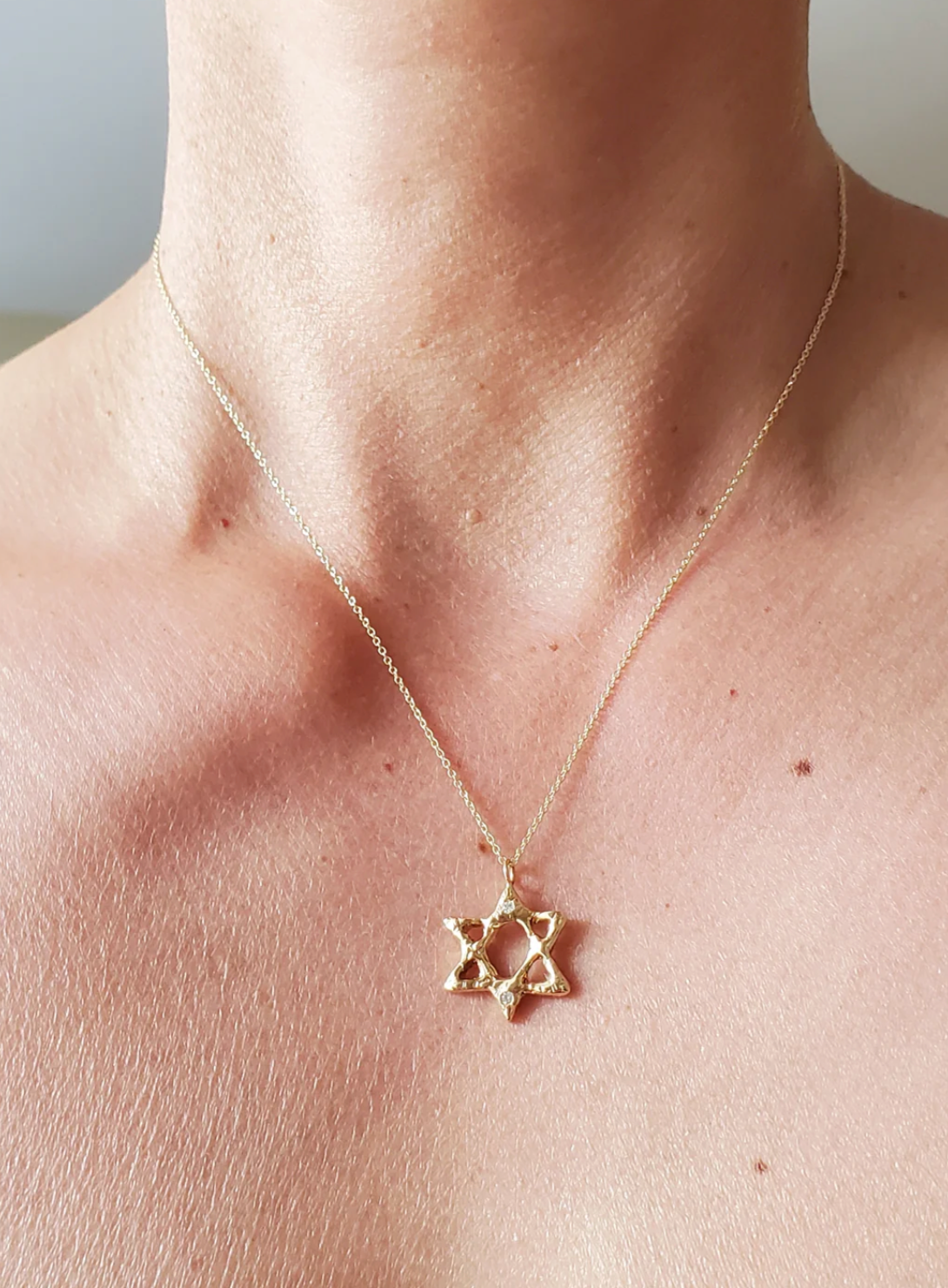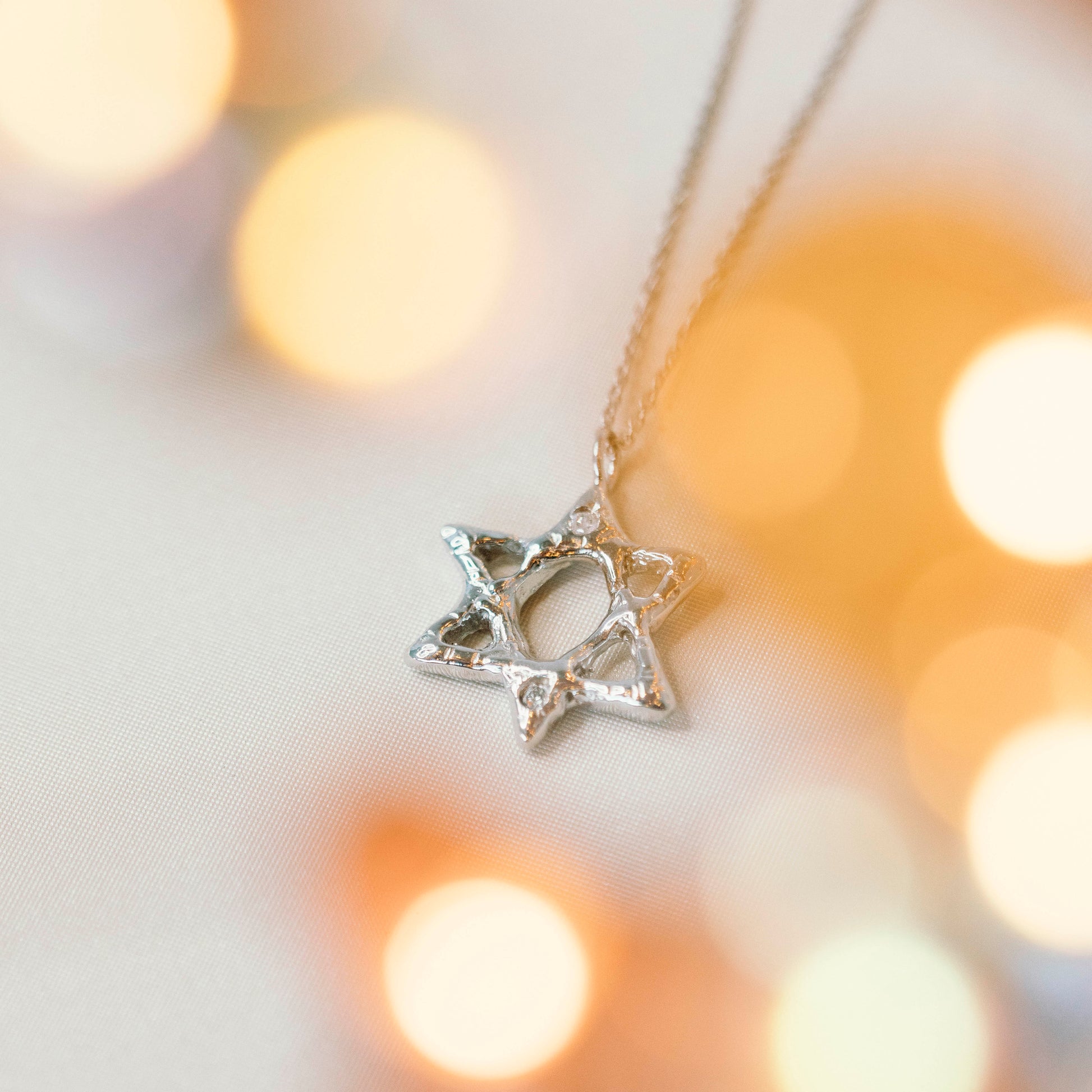 The Star Of David necklace is a timeless symbol of faith and heritage. Crafted in 14k white gold, it features 2 accent diamonds that add a subtle touch of sparkle. A must-have for any jewelry collection, this necklace is a beautiful and meaningful accessory.