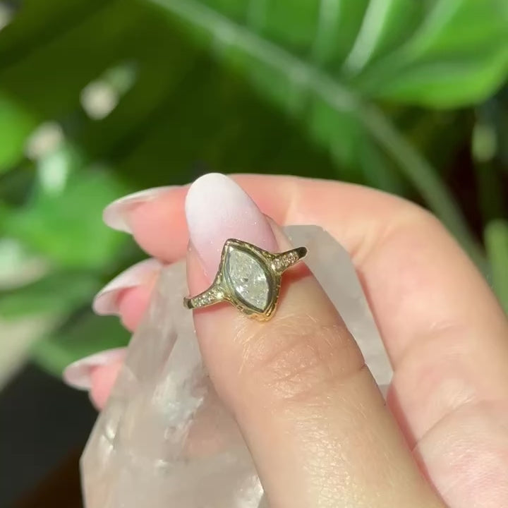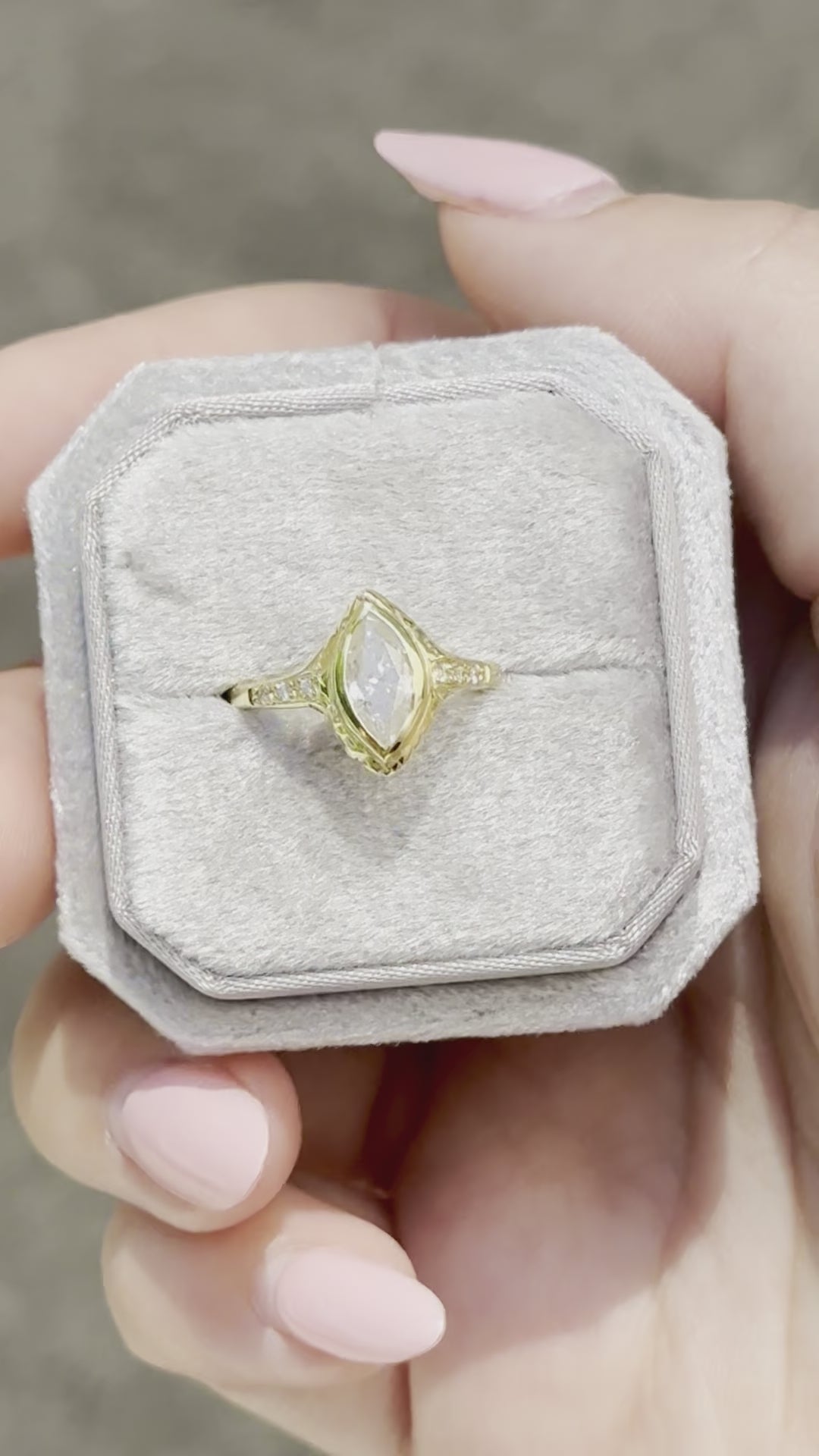 Featuring a marquise Salt and Pepper diamond flanked on either side by sparkling diamonds and unique gold detailing, this ring is truly unlike any other. However you choose to wear this ring, it will be a piece you treasure for a lifetime.