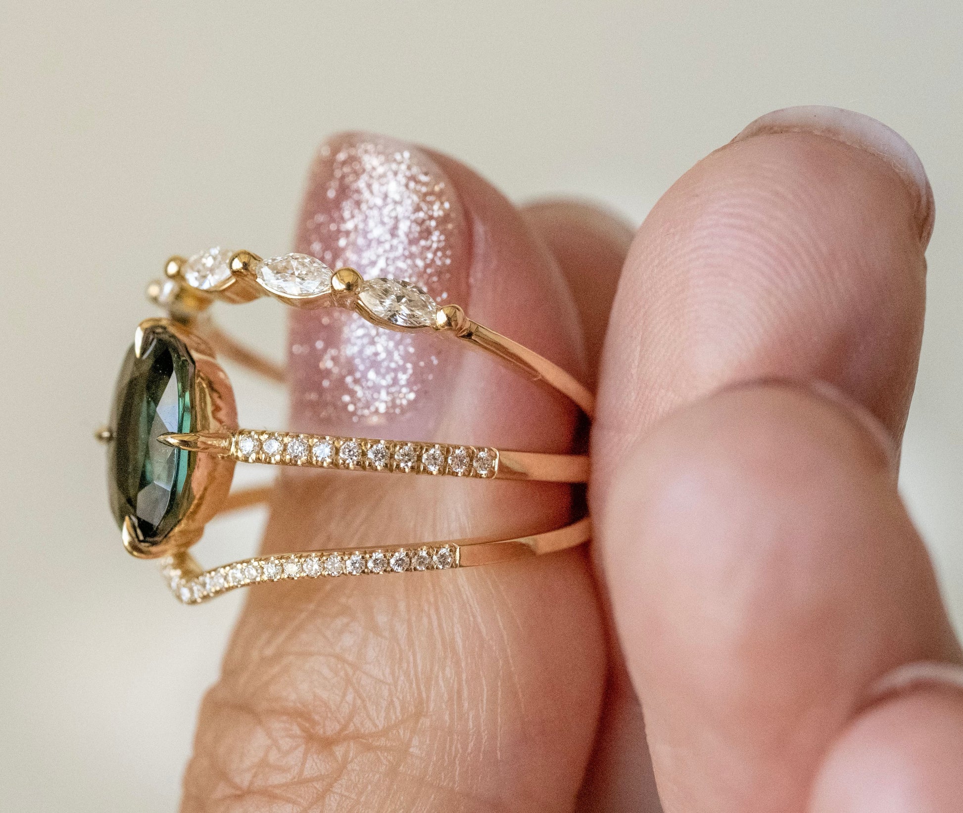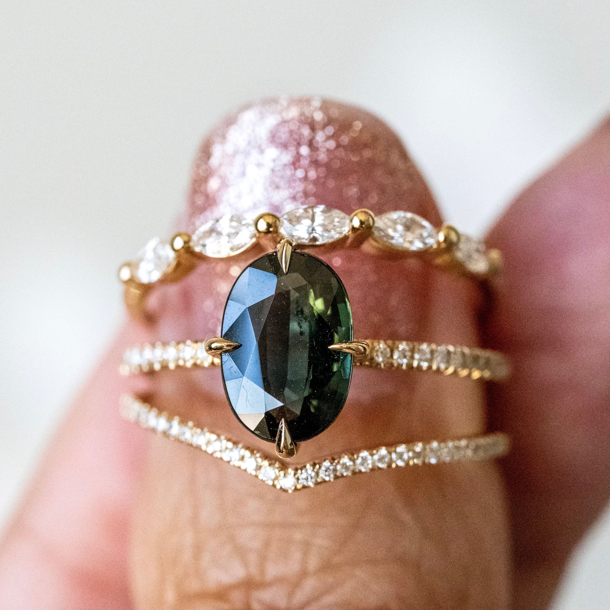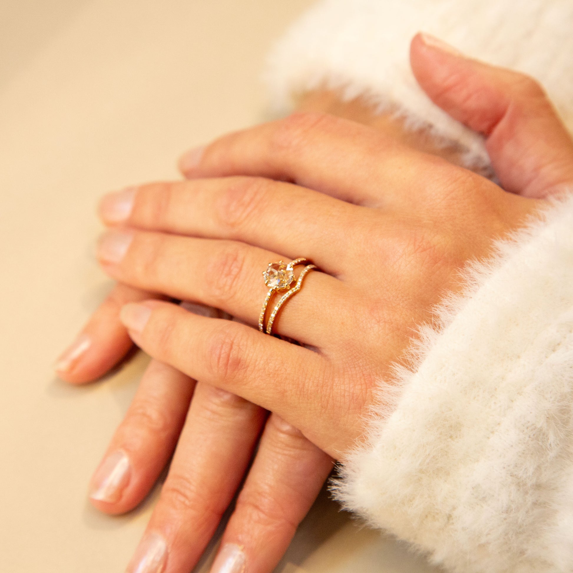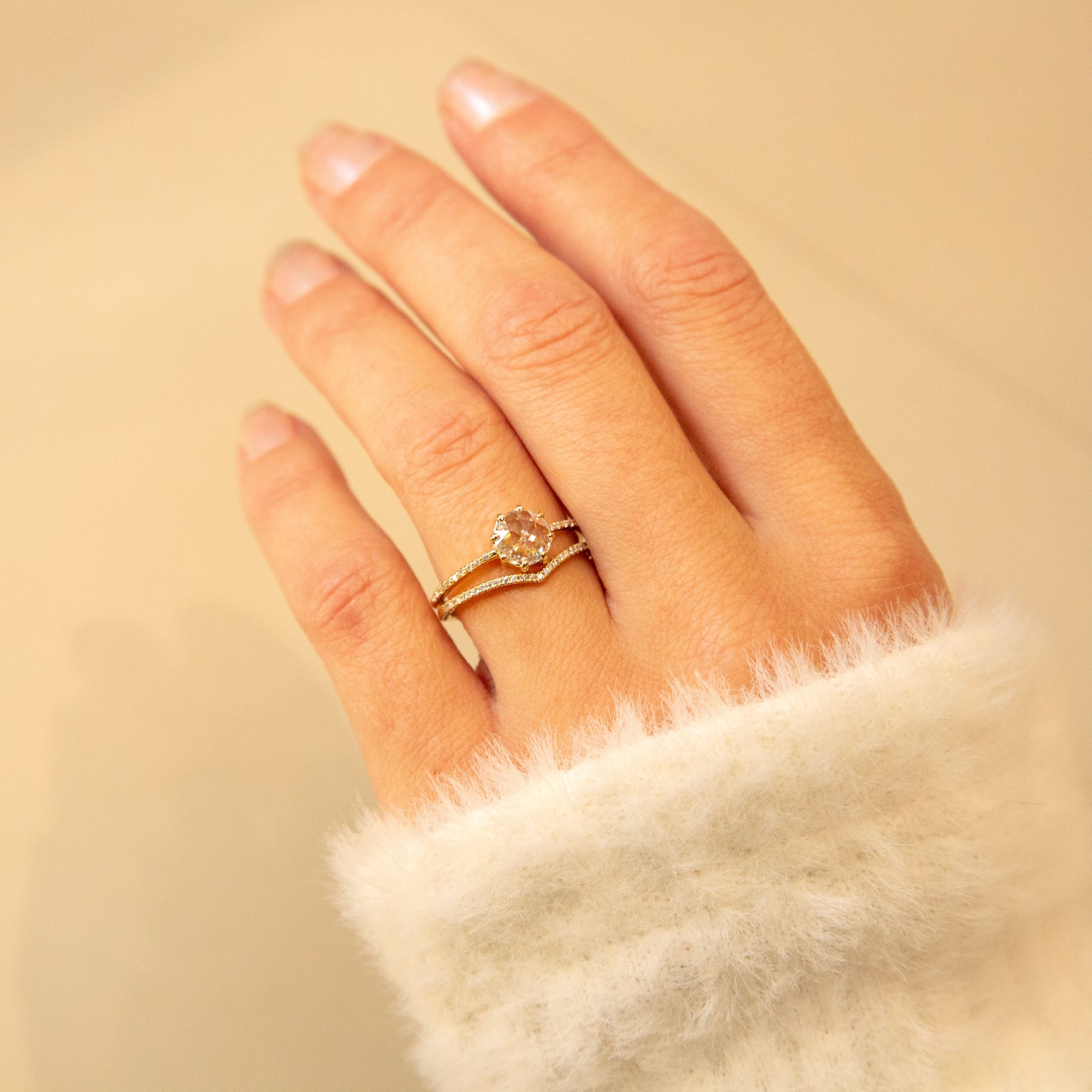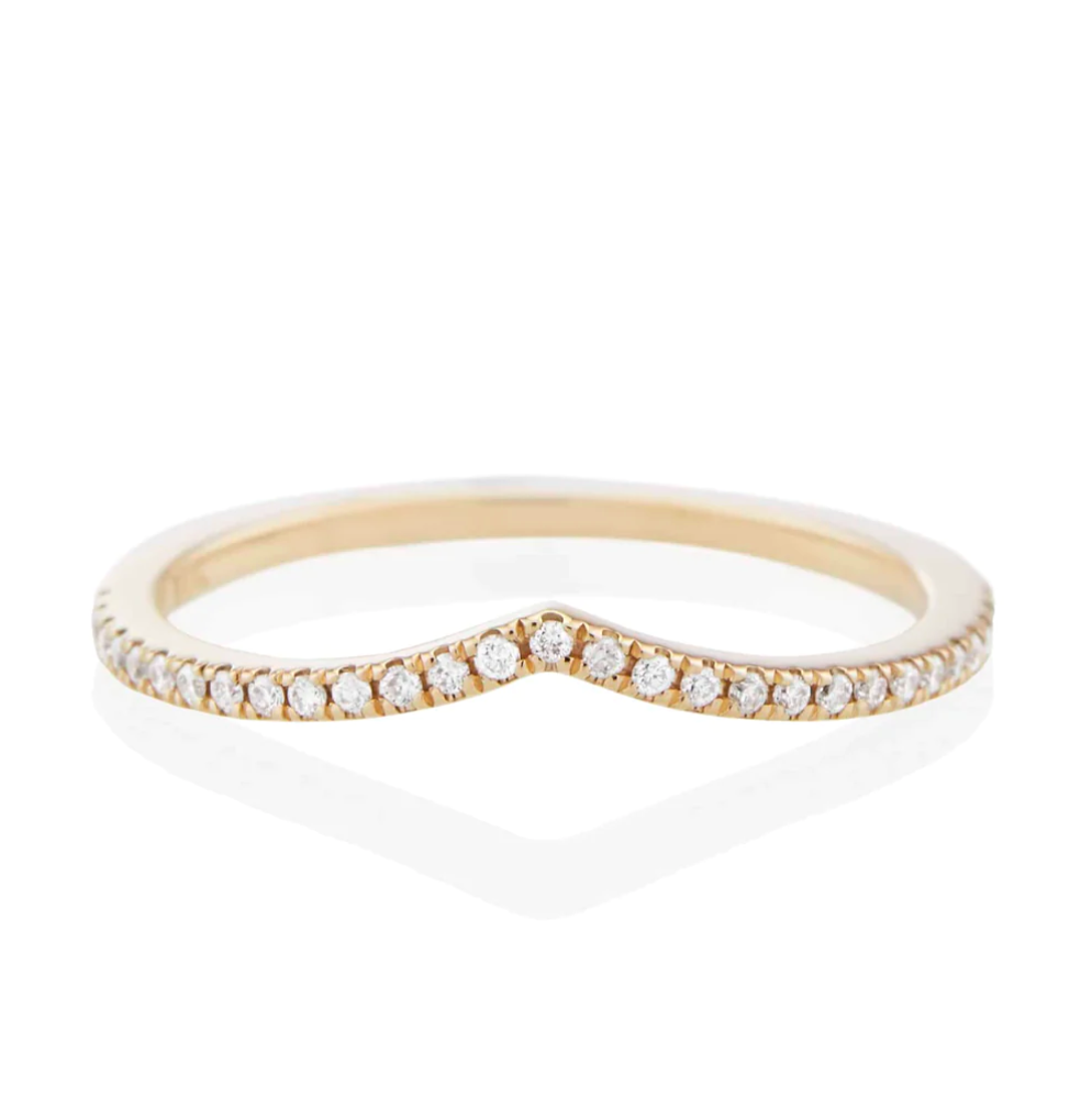 With its delicate v-shaped dip, this ring exudes a subtle and graceful charm. The half-pavé setting, adorned with dainty white diamonds, adds a touch of sparkle that beautifully complements any ensemble. Whether worn alone for a distinctive sparkle or paired with another ring for a unique combination, this ring offers an offbeat and captivating allure.