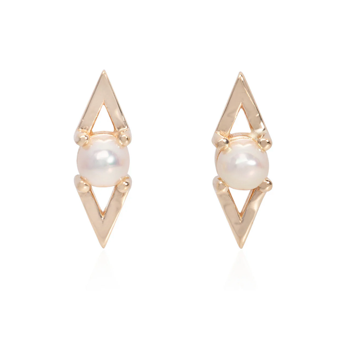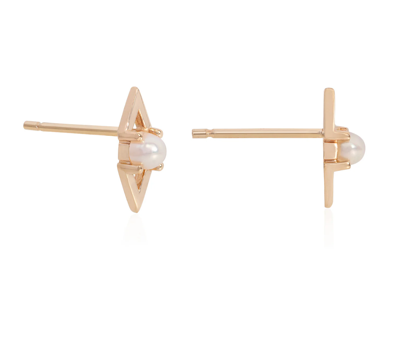 Not your everyday pearl earrings, these sweet cabochon cut pearls is perfectly set against this double v-shape style. Set in 14K yellow, white or rose gold. Post and pushback finish.