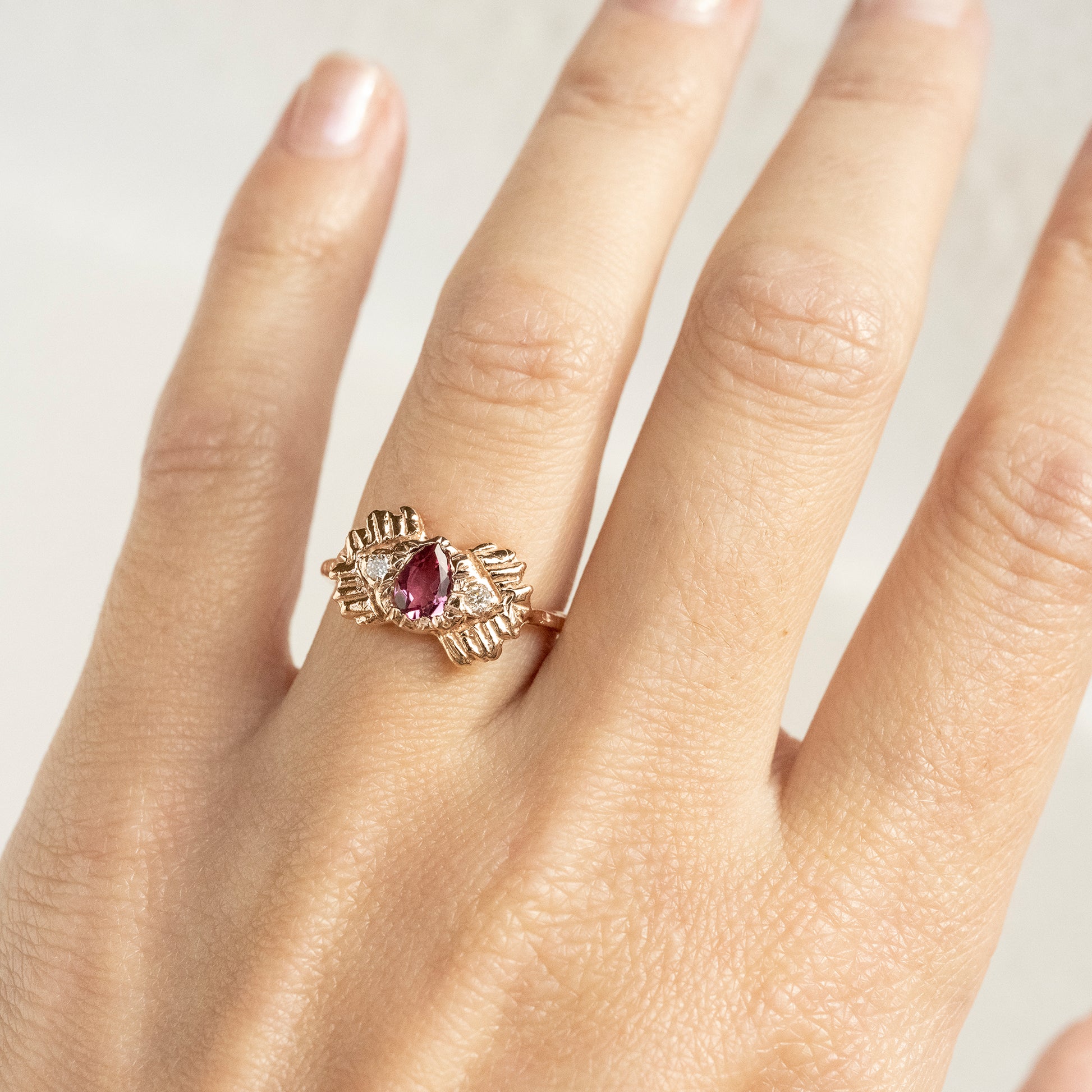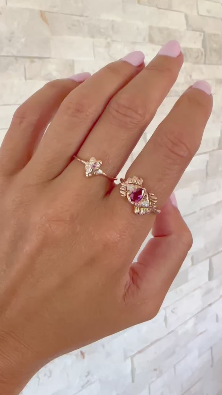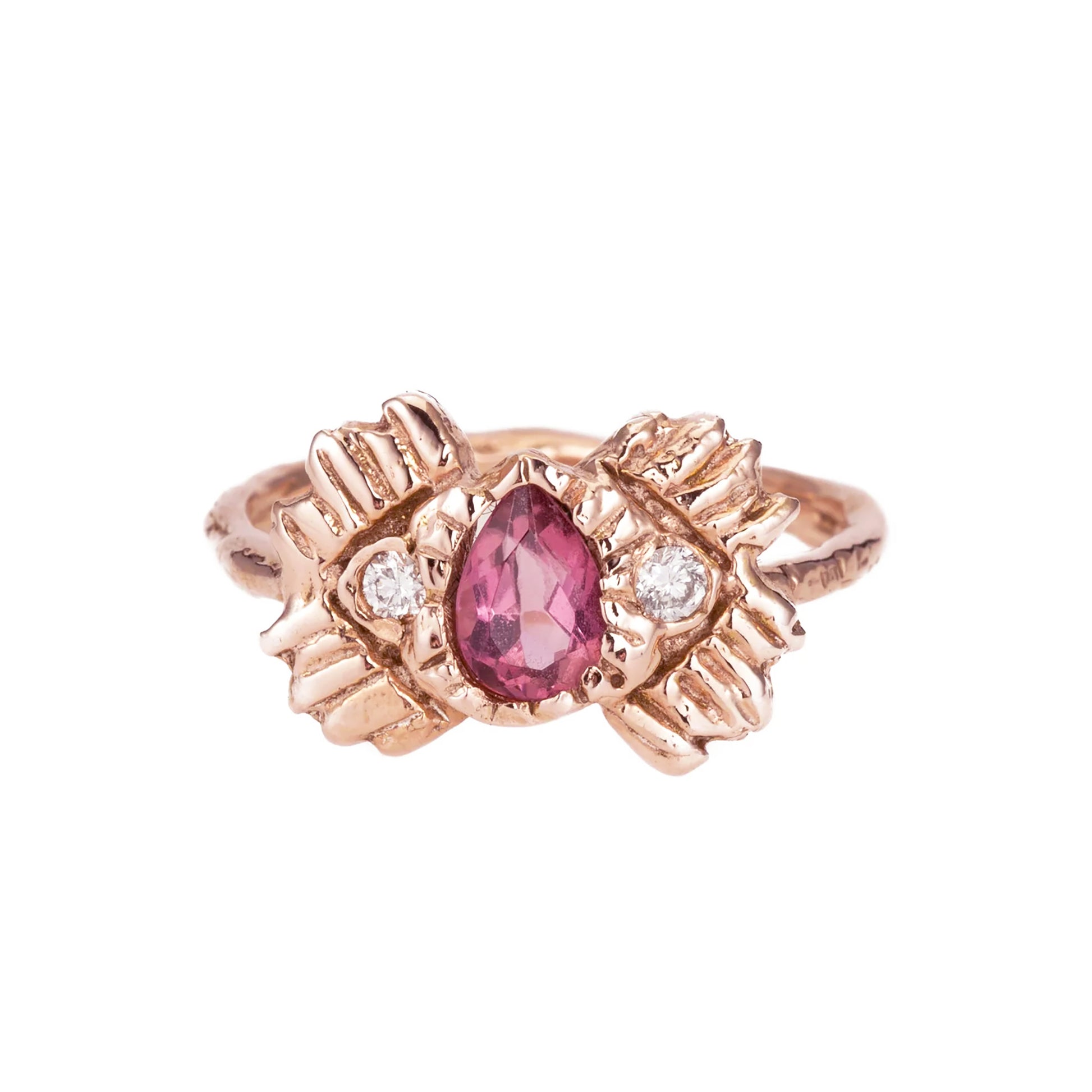 This ring embodies protection and is set in stunning rose gold. The pink tourmaline set in the middle encourages love, gently disperses emotional pain and dissolves disruptive feelings. The two diamonds on each side add visual balance and a little extra sparkle we could all use in our lives.