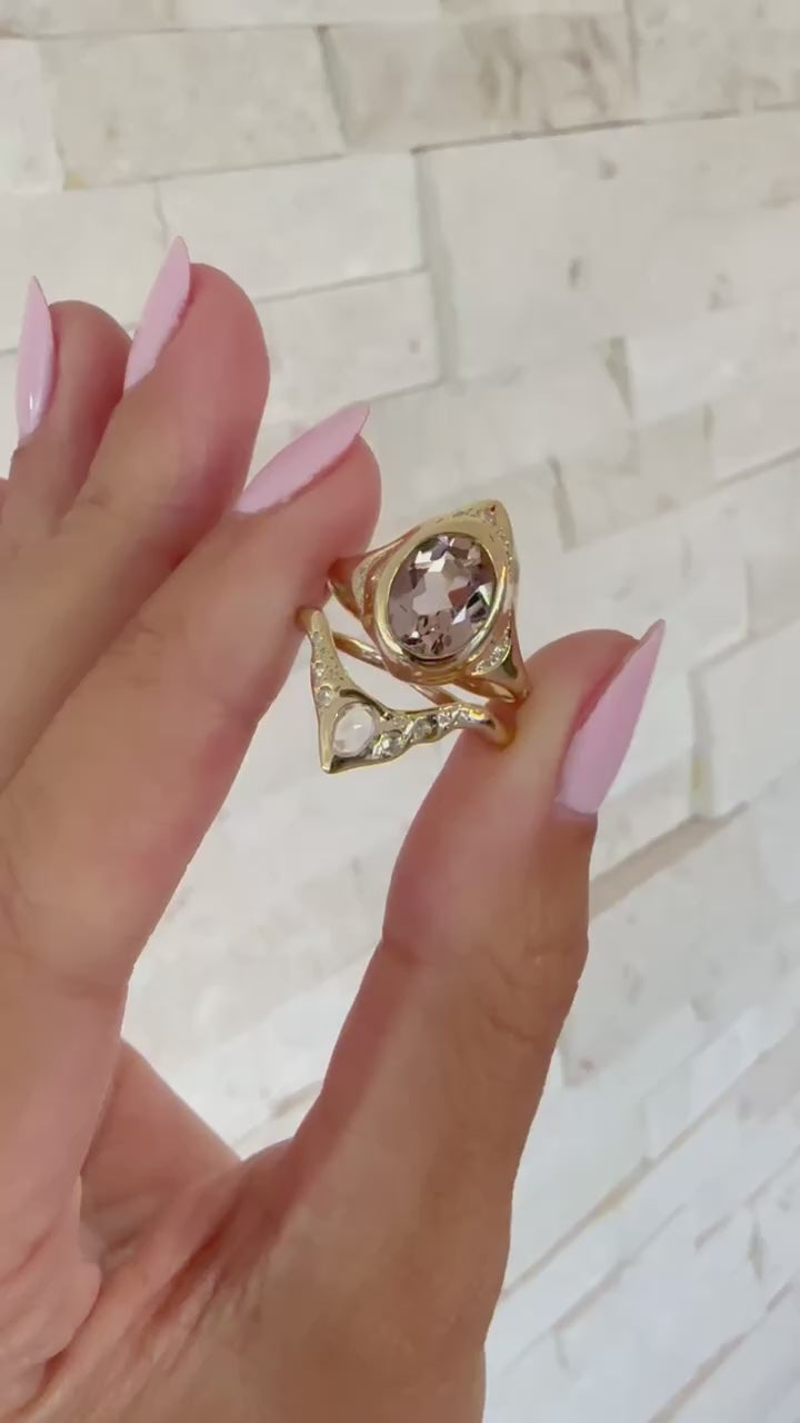The warm pink tourmaline captures the essence of a breathtaking afterglow, creating a radiant display that glimmers with enchanting beauty. Through its captivating windows, diamond light dances and gleams, adding a touch of celestial brilliance to this remarkable ring.